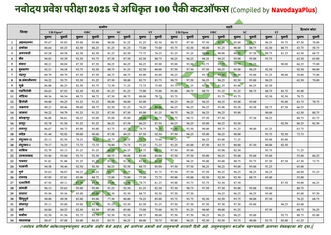 मागील वर्षाच्या या कट-ऑफवरून एक गोष्ट निश्चित आहे - नवोदय प्रवेश परीक्षा गांभीर्याने घ्यायला हवी. तुमच्या जिल्ह्याचा आणि कॅटेगरीचा कट-ऑफ लक्षात घेऊन तुमचे ध्येय निश्चित करा आणि आजपासूनच तयारीला लागा.तुमच्या पुढील वाटचालीस खूप खूप शुभेच्छा!